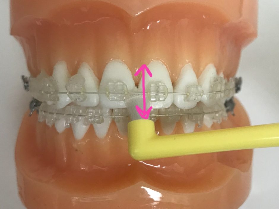 歯間ブラシは通常、歯と歯の間に使用しますが、矯正患者さんの場合、ブラケットとブラケットの間に食べ物がつまりやすいので、歯間ブラシを歯面と平行に、縦に動かします👍