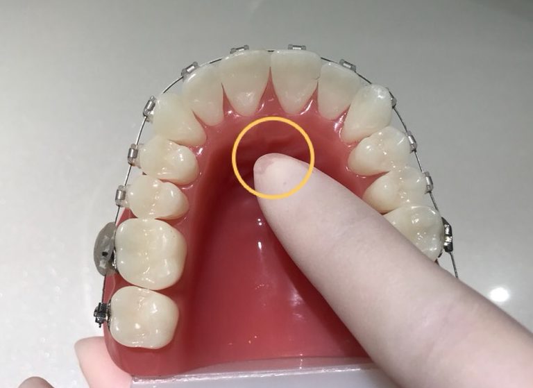 前歯を裏側から押しているような状態になったり、下顎の下の方に落ち込んでいたりします。